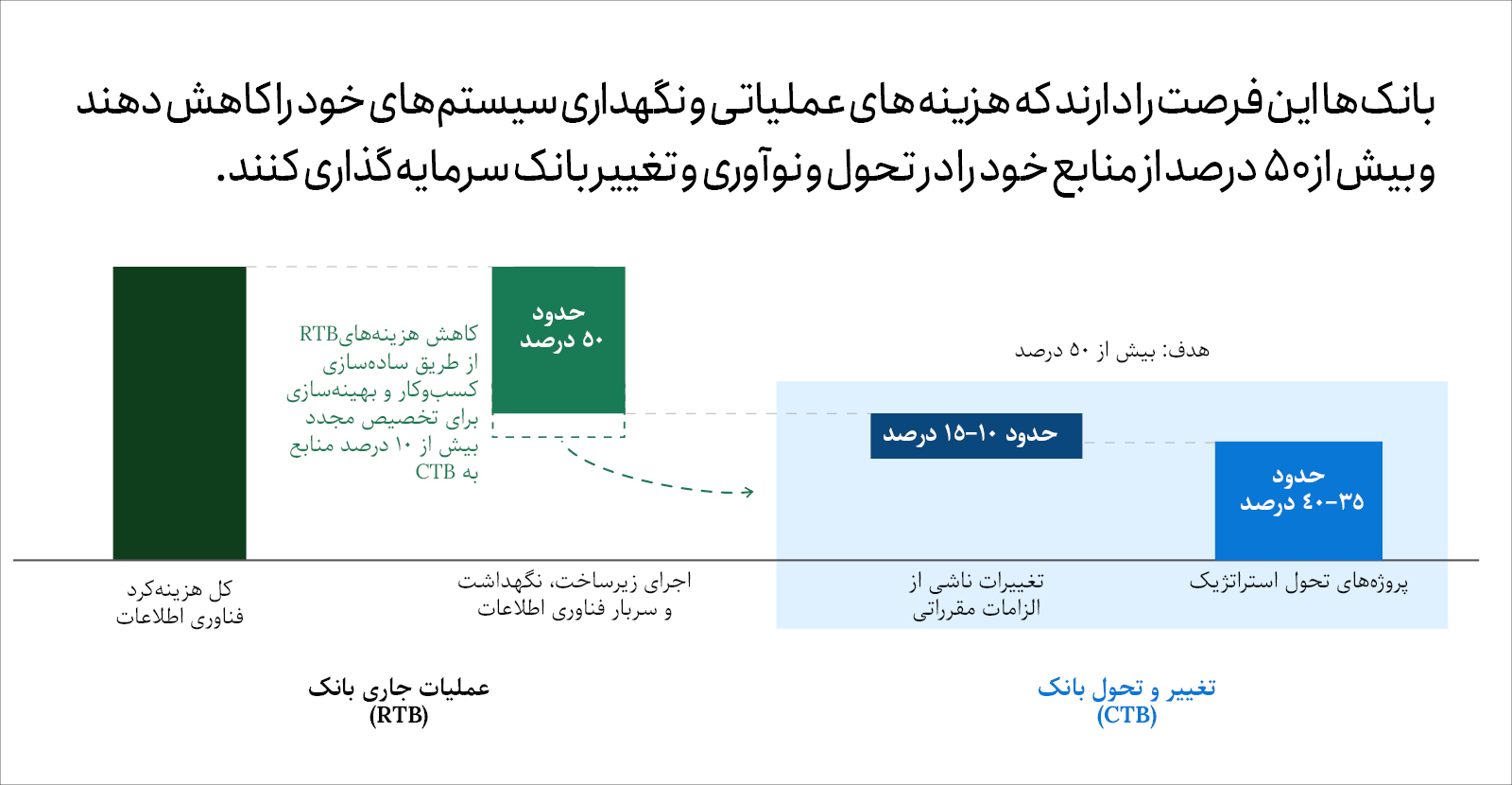 بخش مهمی از پاسخ را میتوان در بررسی نحوه و محل خرج کردن بودجه فناوری بانکها یافت. بخش عمدهای از سرمایهگذاری فناوری بانکها امروز به فعالیتهای «Run-the-Bank» (نگهداری سیستمها) اختصاص دارد؛ مانند اجرای برنامههای موجود و نه به تلاشهای «Change-the-Bank» (تحول و نوآوری) که میتواند قدرت رقابتی واقعی ایجاد کند. بدون شک، بسیاری از بودجه نگهداری سیستمها لازم و بهجا مصرف میشود، اما حتی اگر بخشی از آن به ابتکارات نوآورانه اختصاص یابد، بانکها میتوانند همافزایی ایجاد کنند و کسبوکار خود را برای رشد آماده کنند.