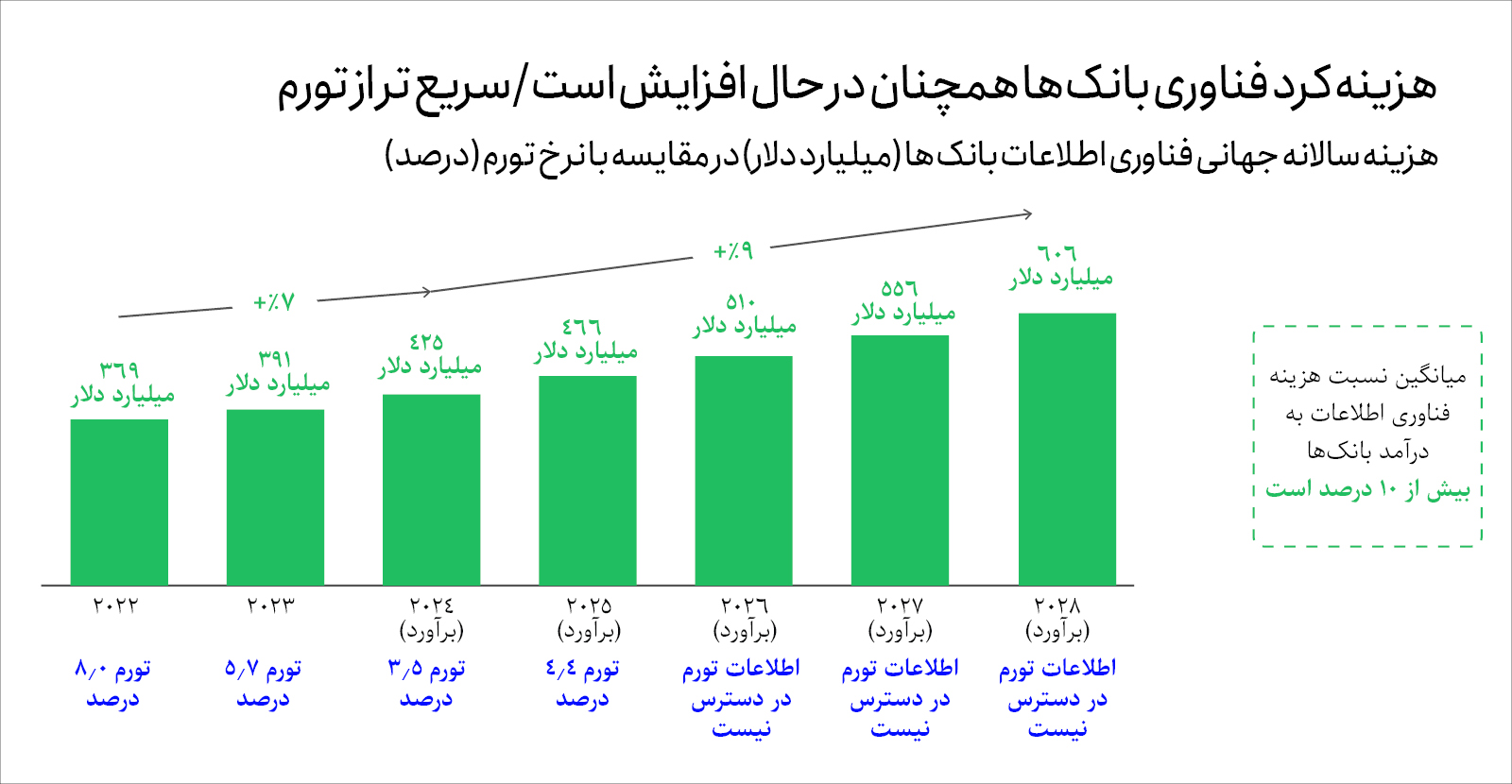 فناوری یکی از هزینههای عمده بانکهاست و بهطور متوسط بیش از ۱۰ درصد از درآمدها را مصرف میکند. طبق دادههای داخلی BCG انتظار میرود هزینههای فناوری اطلاعات بانکها در سراسر جهان با نرخ ترکیبی سالانه ۹درصد رشد کند که بالاتر از نرخ تورم پیشبینیشده است. عوامل مؤثر بر این افزایش هزینه شامل موارد زیر است: