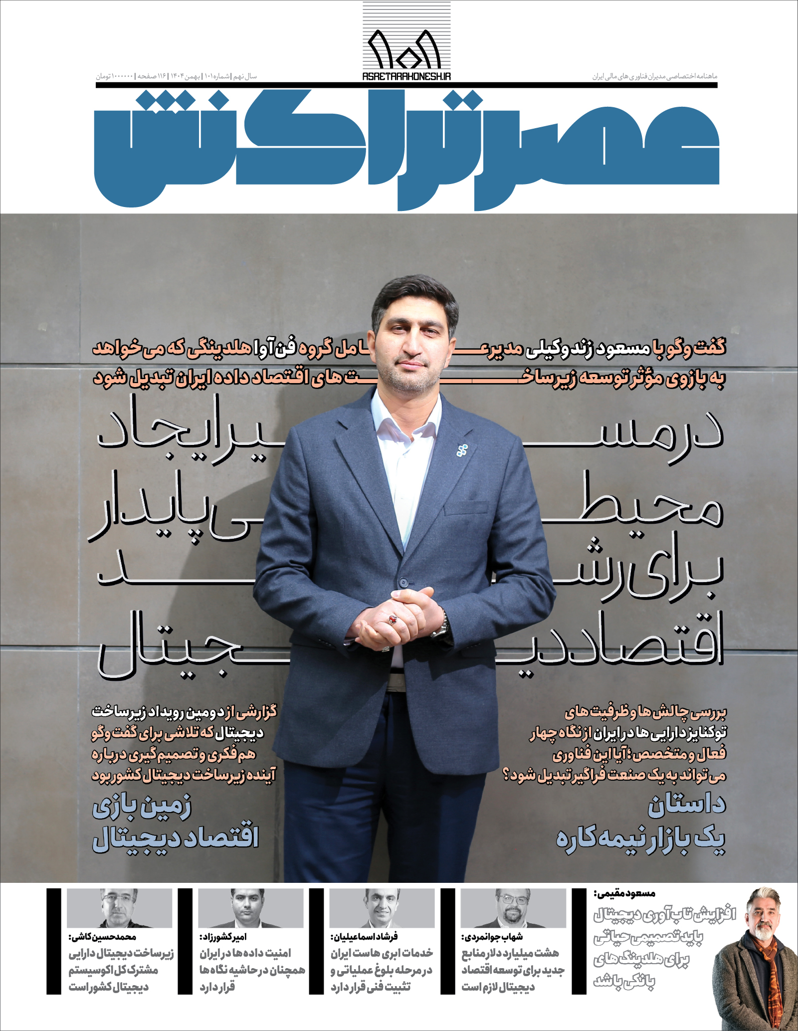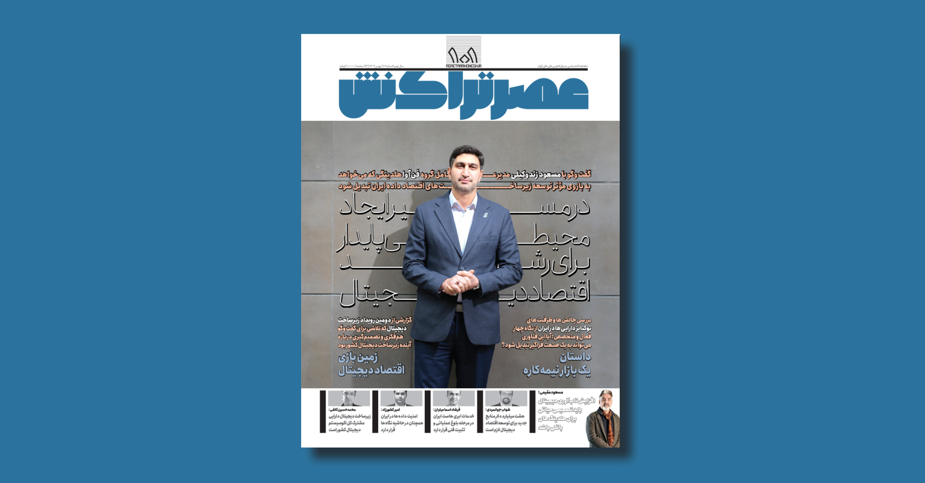 عصر تراکنش ۱۰۱ / شماره ۱۰۱ ماهنامه عصر تراکنش با تصویر روی جلد مسعود زندوکیلی، مدیرعامل گروه فنآوا منتشر شد. این گفتوگو به بهانه بیستوسومین سالگرد تأسیس فنآوا انجام شده و روایتی است از مسیر حرفهای زندوکیلی؛ مسیری که از کارشناسی شبکه آغاز شده و به مدیرعاملی یک هلدینگ فناورانه رسیده است. او در این گفتوگو توضیح میدهد چگونه با تلفیق دانش فنی و نگاه مدیریتی به این جمعبندی رسیده که فناوری صرفاً ابزار نیست، بلکه سیستمی است که باید هوشمندانه طراحی و در زنجیره ارزش ملی ادغام شود. ورود او به فنآوا با یک تغییر رویکرد جدی همراه بوده؛ حرکت از پروژهمحوری به سمت ساخت دارایی، زیرساخت و زیستبومهای دیجیتال و تلاش برای تبدیل فنآوا به بازوی مؤثر توسعه زیرساختهای اقتصاد دادهمحور ایران.